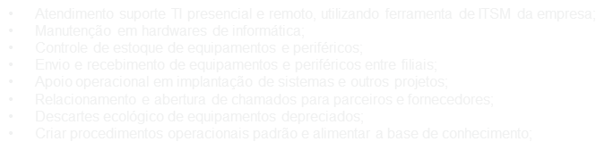 • Atendimento suporte TI presencial e remoto, utilizando ferramenta de ITSM da empresa;